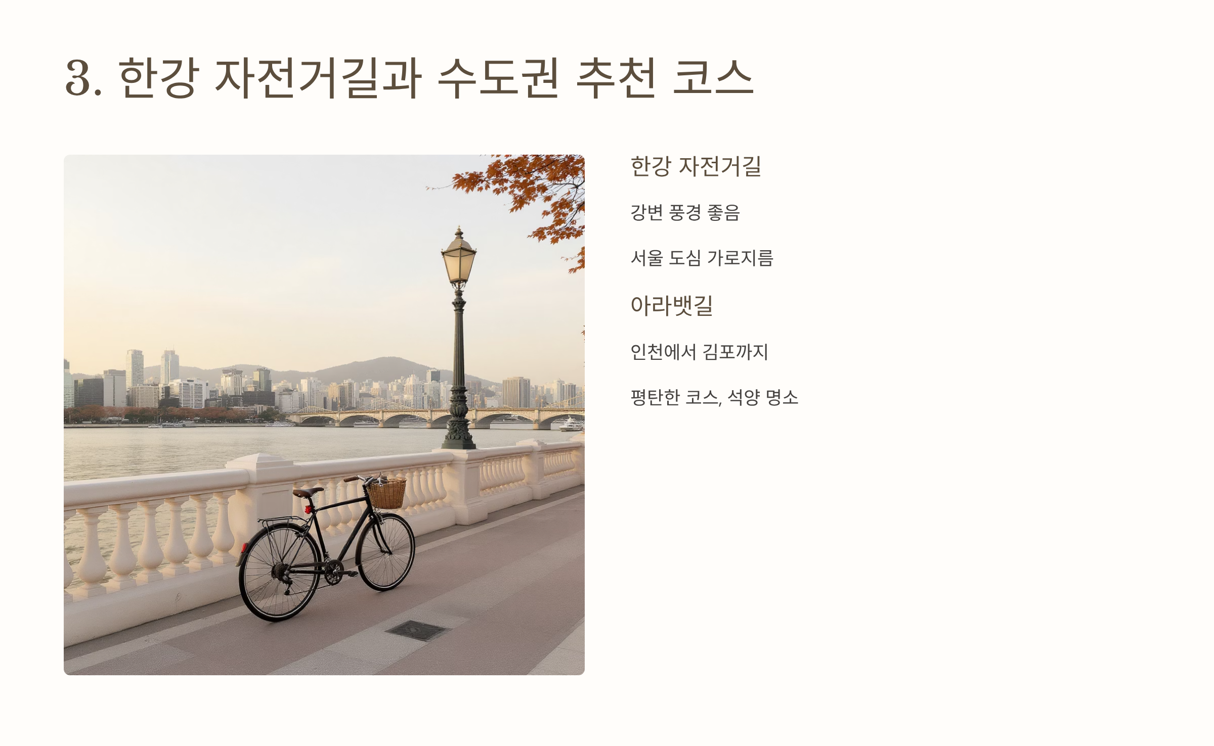 - 한강 자전거길: 강변 풍경이 좋고, 서울 도심을 가로지르며 다양한 코스 선택 가능