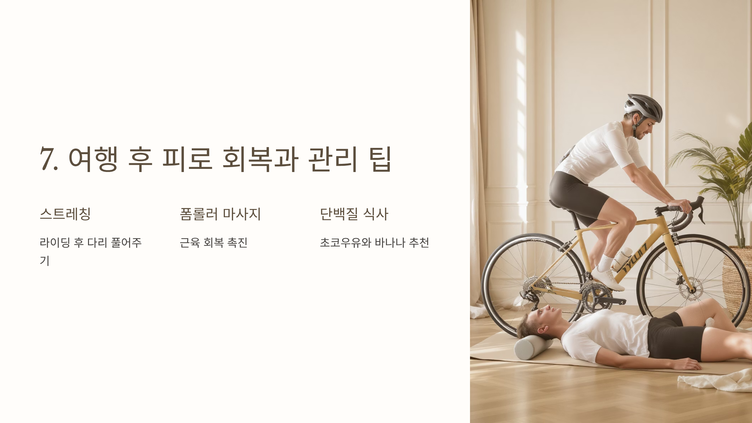 라이딩 후 다리가 뻐근하다면 스트레칭과 폼롤러 마사지를 꼭 해주세요. 그리고 따뜻한 물로 샤워 후 단백질 위주의 식사를 하면 근육 회복이 빨라집니다. 저는 라이딩 후 초코우유와 바나나를 꼭 먹어요.