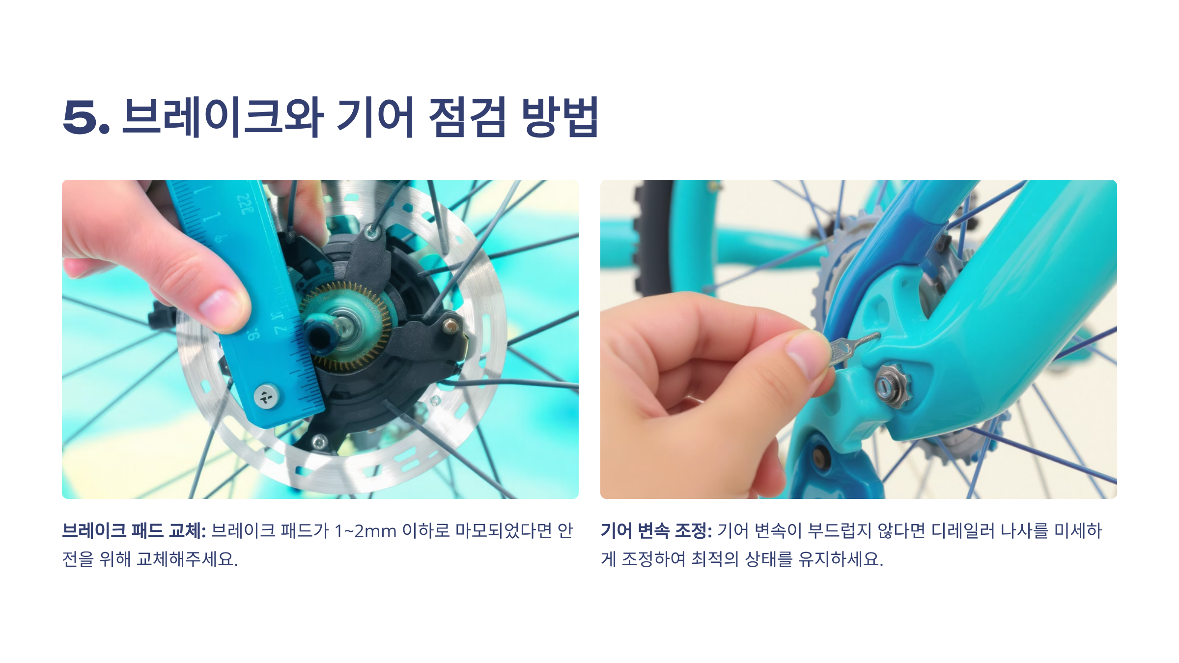 브레이크 패드가 1~2mm 이하로 닳았다면 교체해야 해요. 또 기어 변속이 부드럽지 않다면 디레일러 나사를 미세 조정해 보세요. 저는 처음엔 어렵다고 느꼈는데, 유튜브 영상을 참고하니 쉽게 조절할 수 있었어요.