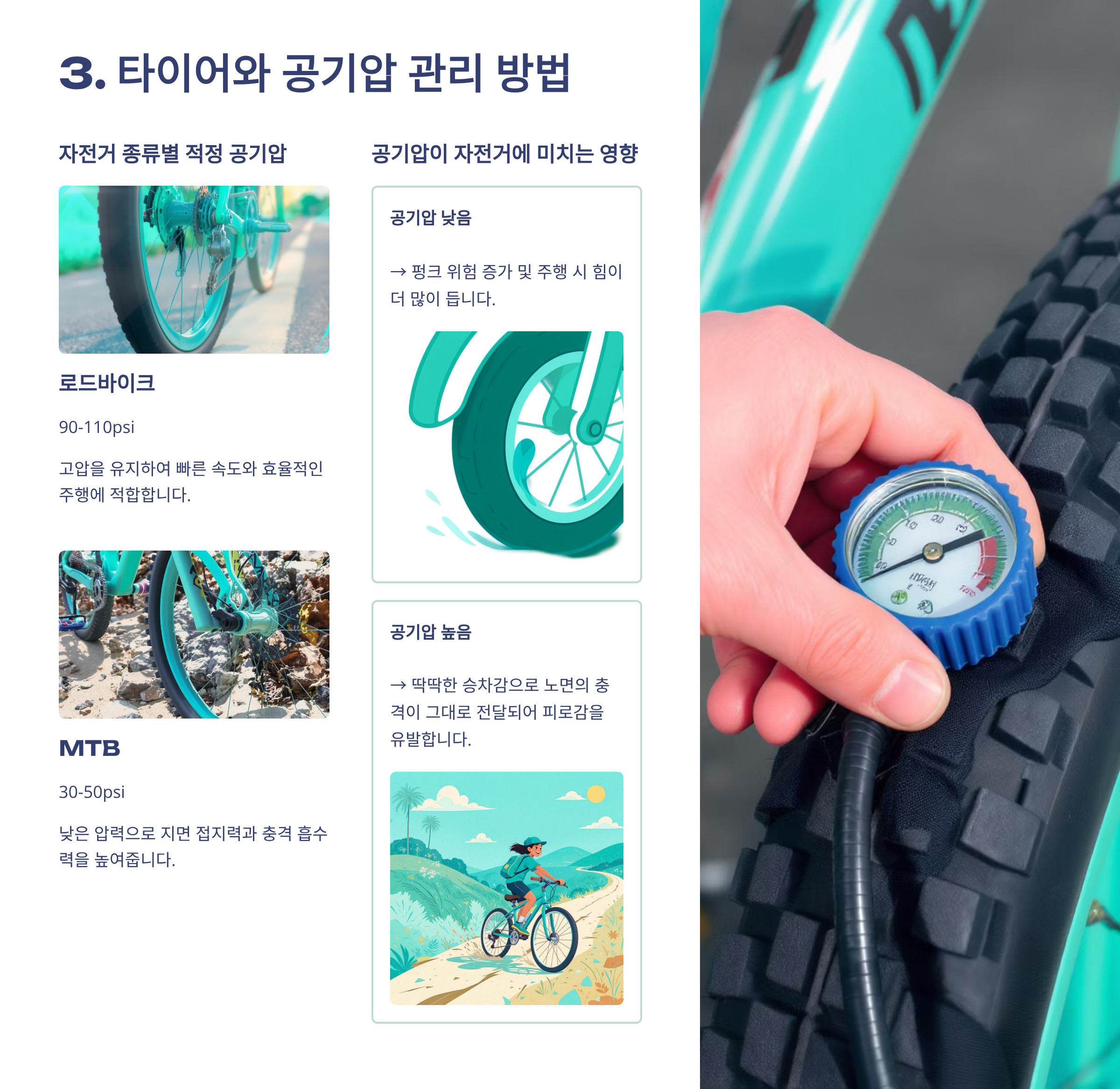 타이어는 마모 상태와 공기압이 가장 중요해요. 공기압이 낮으면 펑크 위험이 커지고, 너무 높으면 승차감이 딱딱해집니다. 스마트폰 앱과 연동되는 공기압 게이지를 사용하면 편리해요. 저는 매주 라이딩 전 반드시 체크합니다.