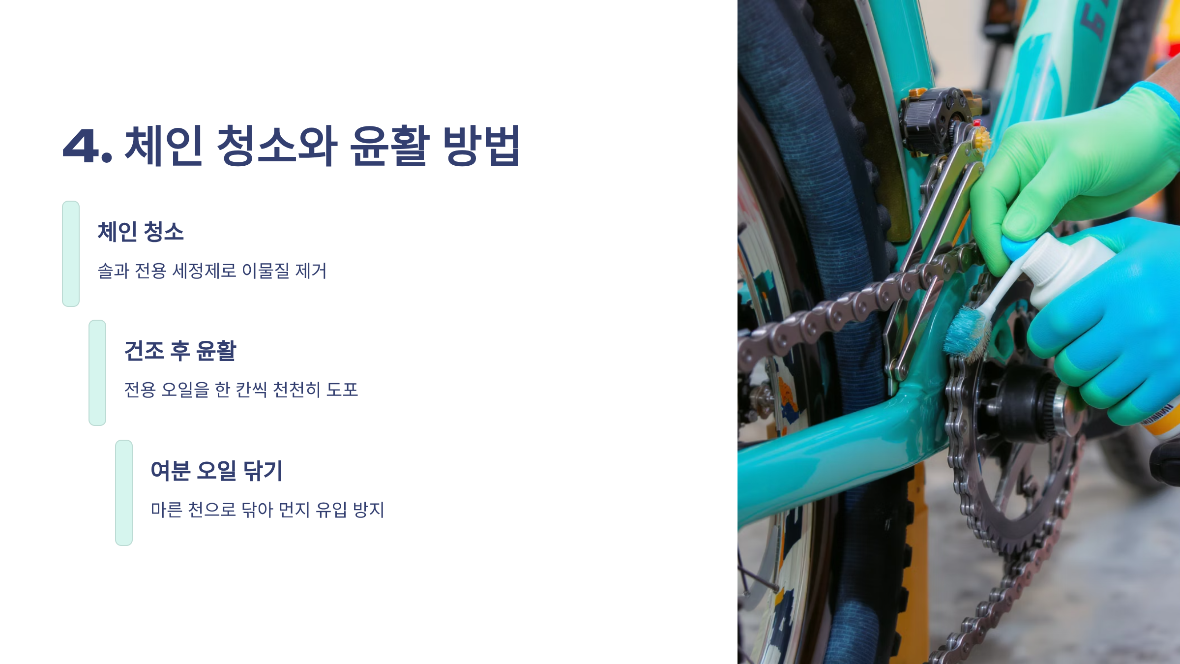 - 체인 청소 – 솔과 전용 세정제를 사용해 이물질 제거