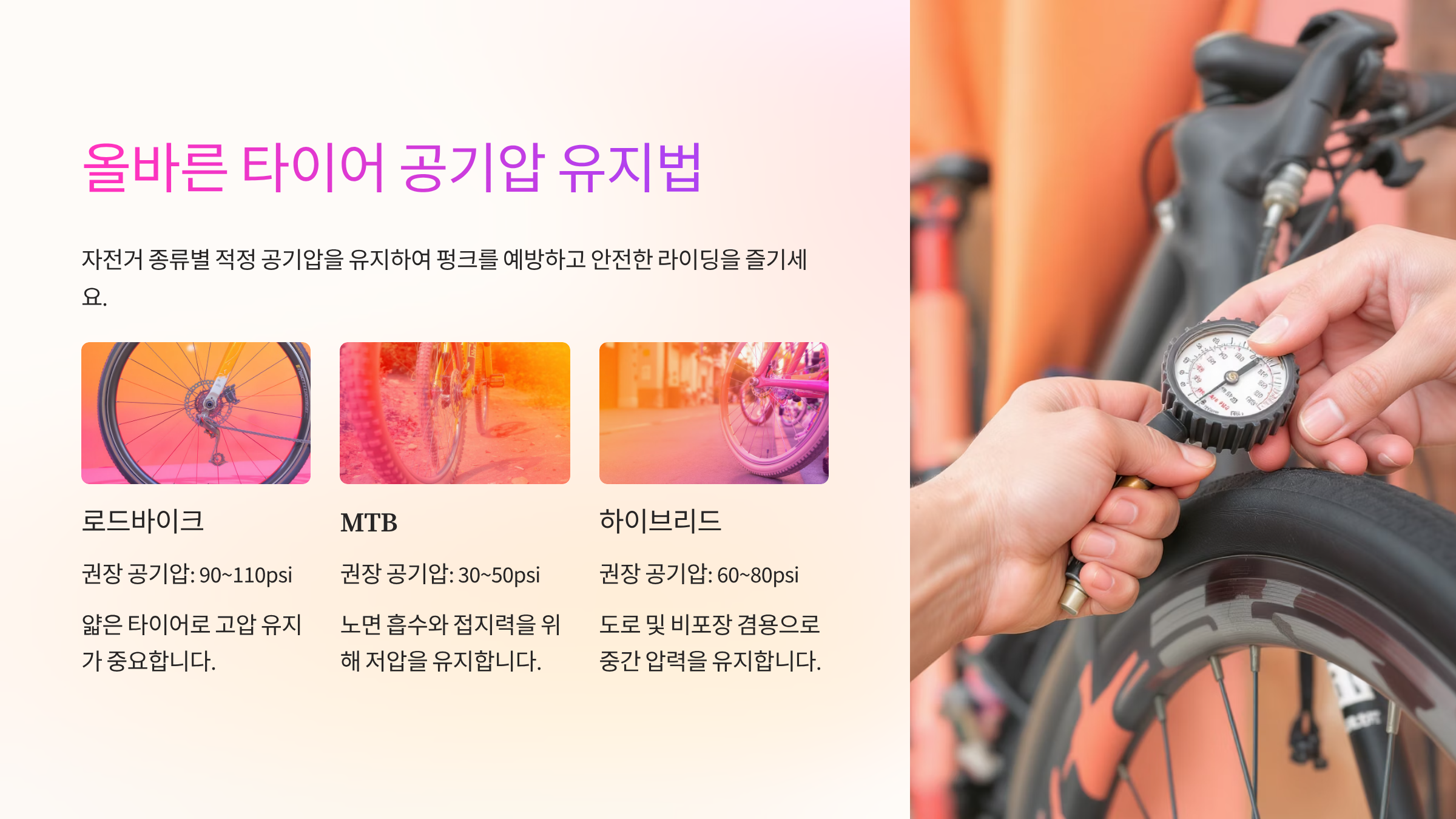 저는 라이딩 전 항상 손으로 눌러보고, 일주일에 한 번은 공기압 게이지로 정확히 측정합니다. 너무 낮으면 펑크 위험, 너무 높으면 승차감이 나빠져요.