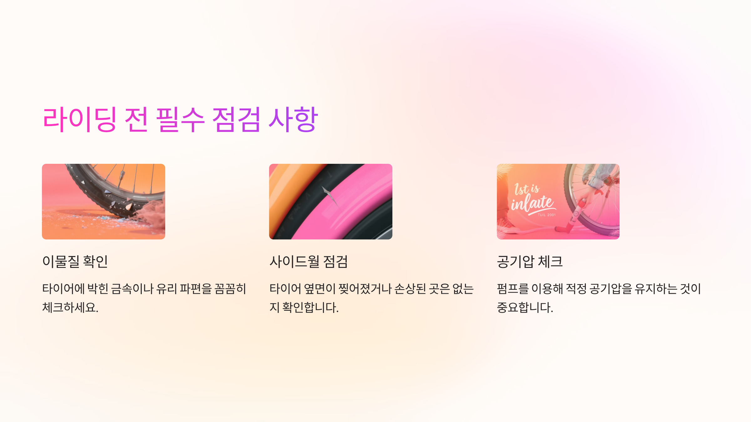 최소 일주일에 한 번, 장거리 라이딩 전에는 꼭 체크하세요.