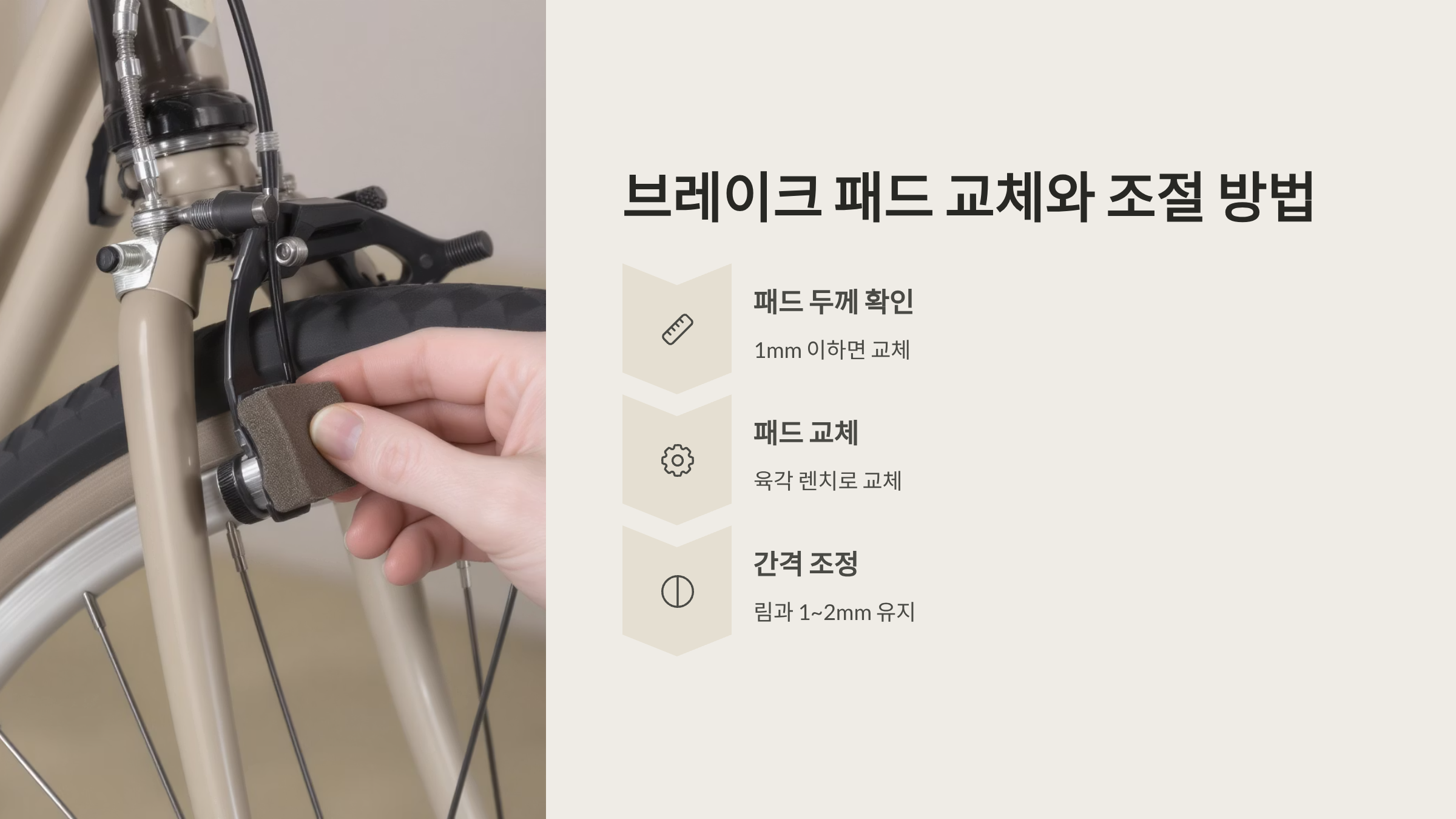 - 브레이크 간격 조정 – 림과 패드 간격이 1~2mm 유지되도록 조정