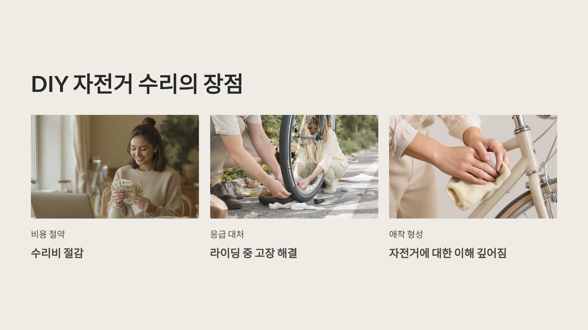 DIY 수리를 배우면 수리비를 절약할 수 있을 뿐 아니라, 라이딩 중 갑작스런 고장에도 대처할 수 있어요. 저는 예전에 라이딩 중 펑크가 났을 때 직접 수리해서 바로 다시 달렸던 경험이 있어요. 직접 수리하면 자전거에 대한 이해도 깊어지고 애착도 생깁니다.