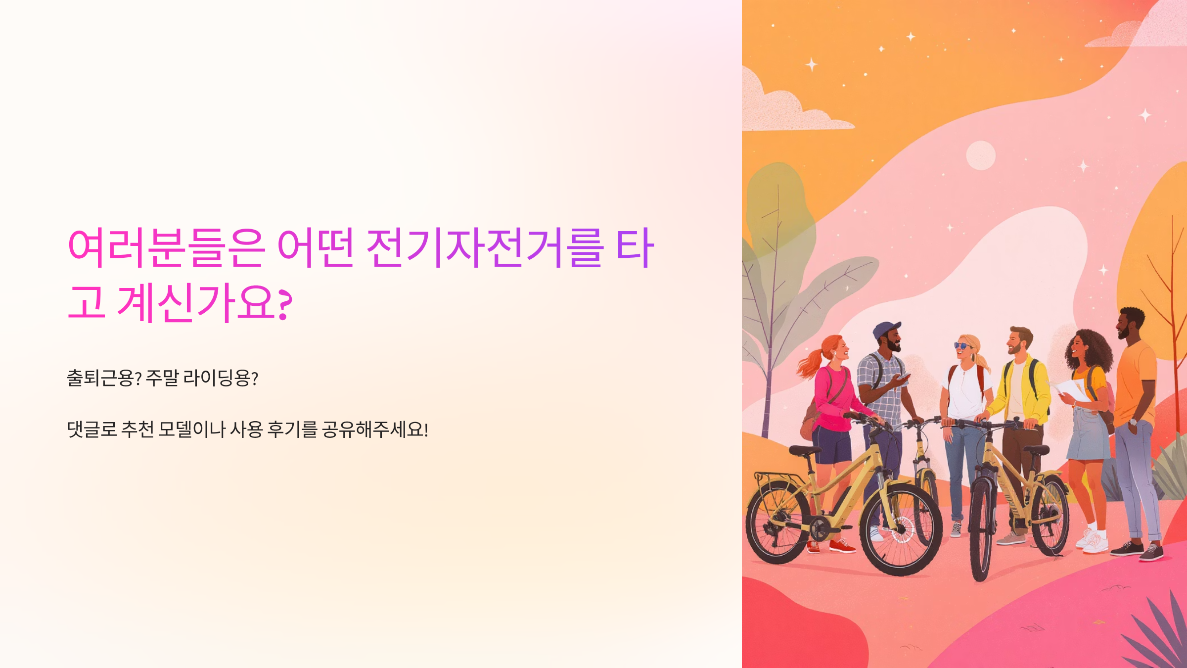 출퇴근용으로 사용하시는지, 주말 라이딩용인지 궁금해요! 댓글로 추천 모델이나 사용 후기를 공유해주세요.