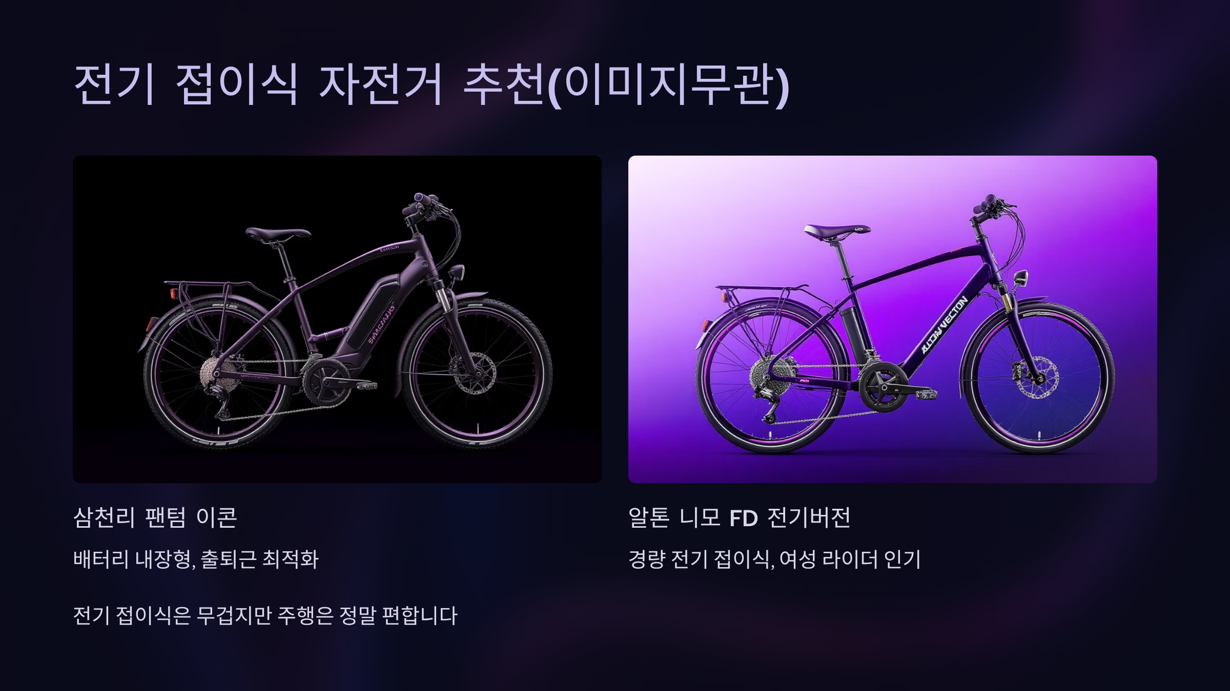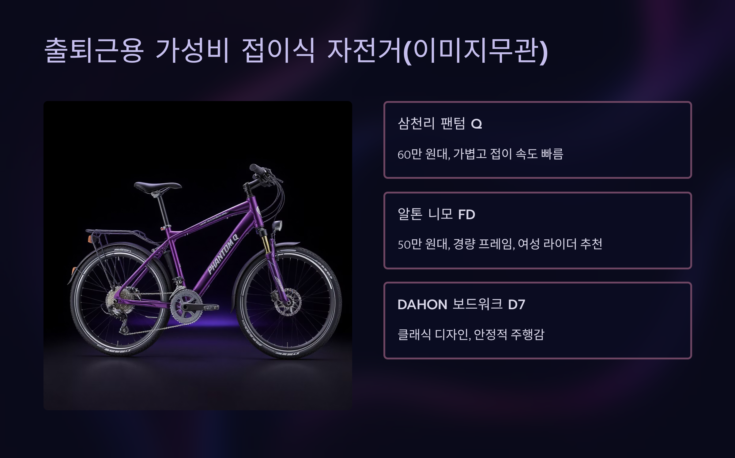- 삼천리 팬텀 Q: 60만 원대, 가볍고 접이 속도가 빨라 직장인들에게 인기