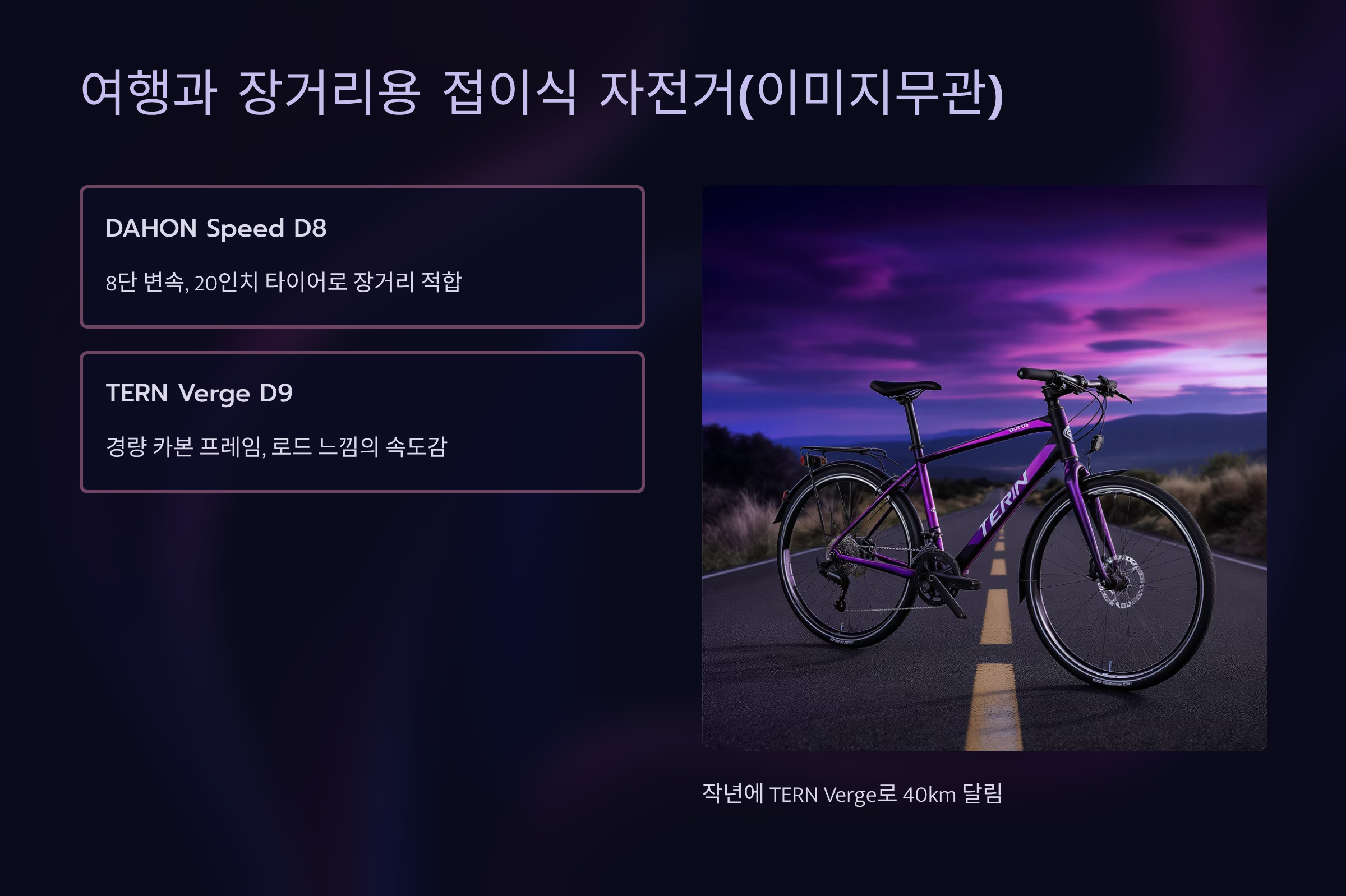 - DAHON Speed D8: 8단 변속, 20인치 타이어로 장거리 적합
