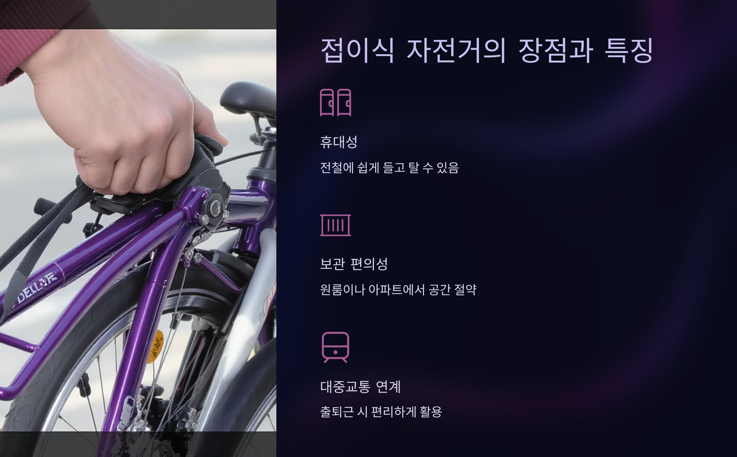접이식 자전거는 휴대성, 보관 편의성, 대중교통 연계가 강점이에요. 저는 예전에 출퇴근용으로 접이식 자전거를 썼는데, 전철에 쉽게 들고 탈 수 있어 정말 편했어요. 특히 원룸이나 아파트에 사는 분들은 공간 절약 효과가 큽니다.