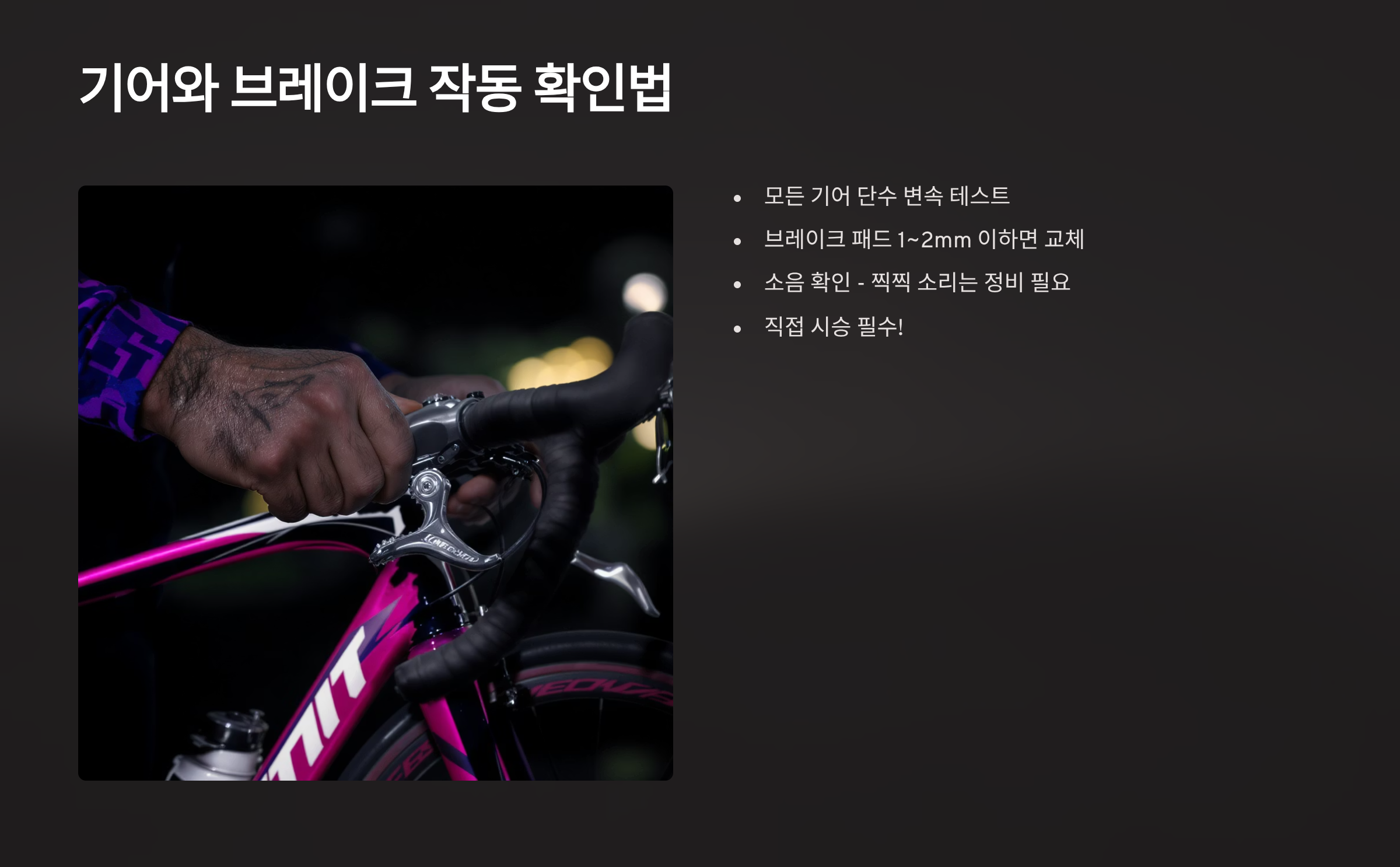 저는 중고 자전거를 사면 첫 한 달 동안은 주행 후 이상 여부를 꼼꼼히 확인합니다.