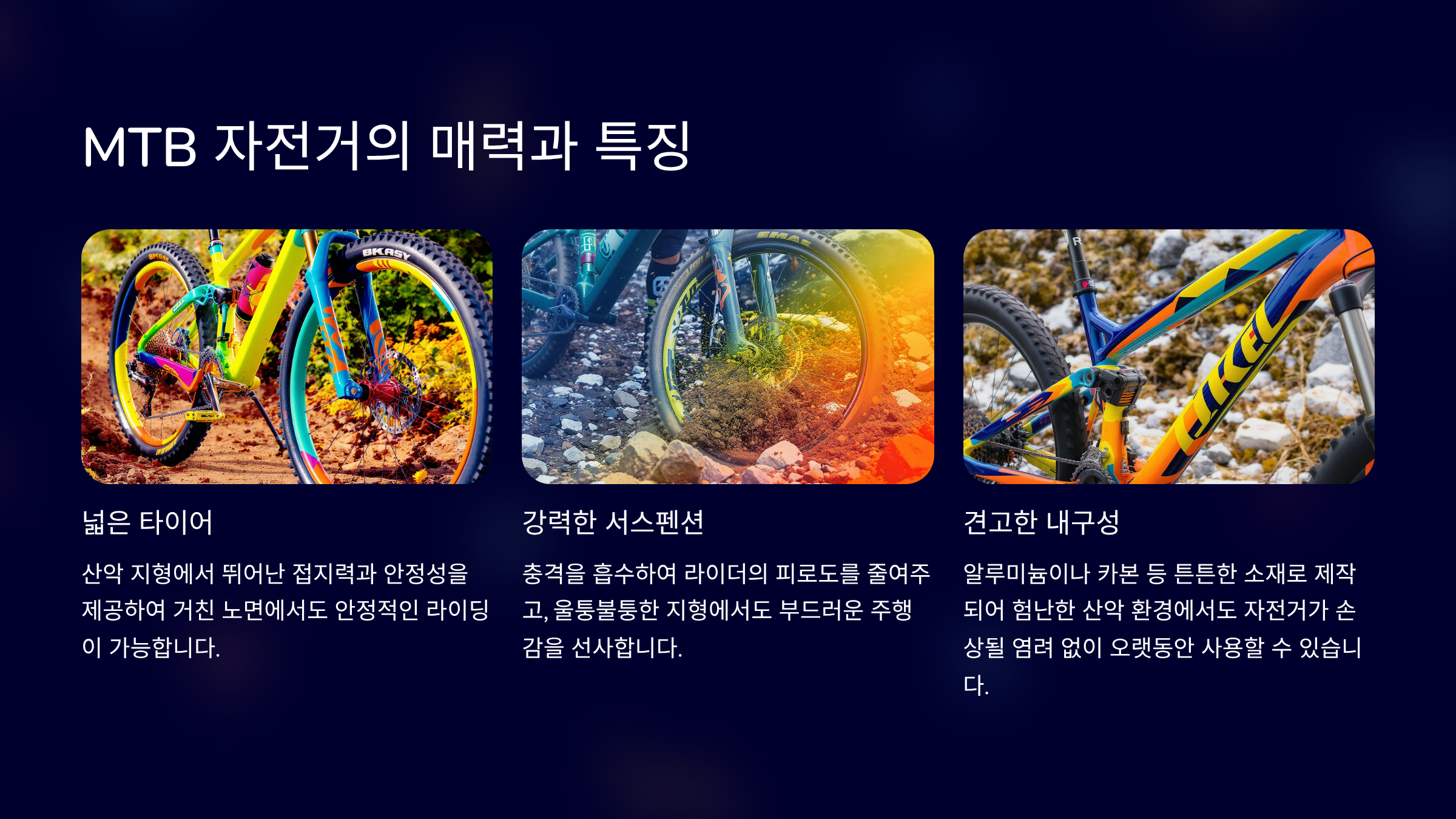 MTB는 일반 자전거와 달리 넓은 타이어, 서스펜션, 강한 내구성이 특징이에요. 저는 MTB를 처음 타고 산길을 내려왔을 때, 로드 자전거와는 비교할 수 없는 짜릿함을 느꼈어요. 비포장 도로나 산악 트레일을 달릴 때 진정한 자전거의 매력을 느낄 수 있습니다.