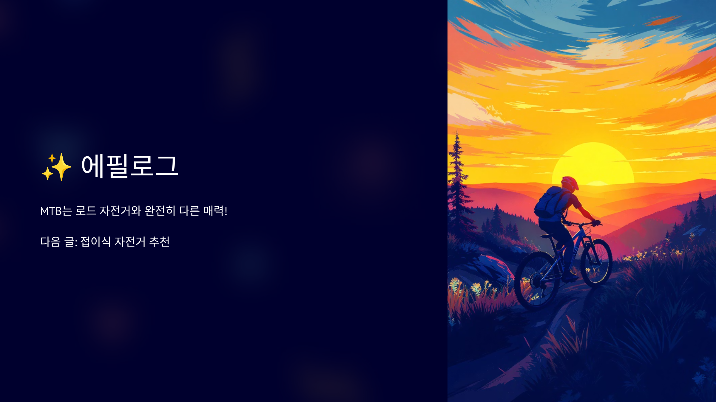 MTB는 한 번 타보면 로드 자전거와는 완전히 다른 매력을 느낄 수 있어요. 저도 MTB 덕분에 주말마다 산악 코스를 찾게 되더라고요. 다음 글에서는 접이식 자전거 추천을 준비 중입니다!